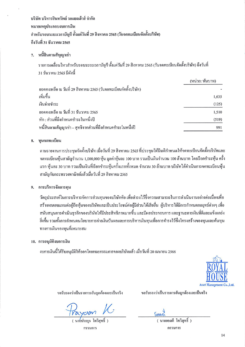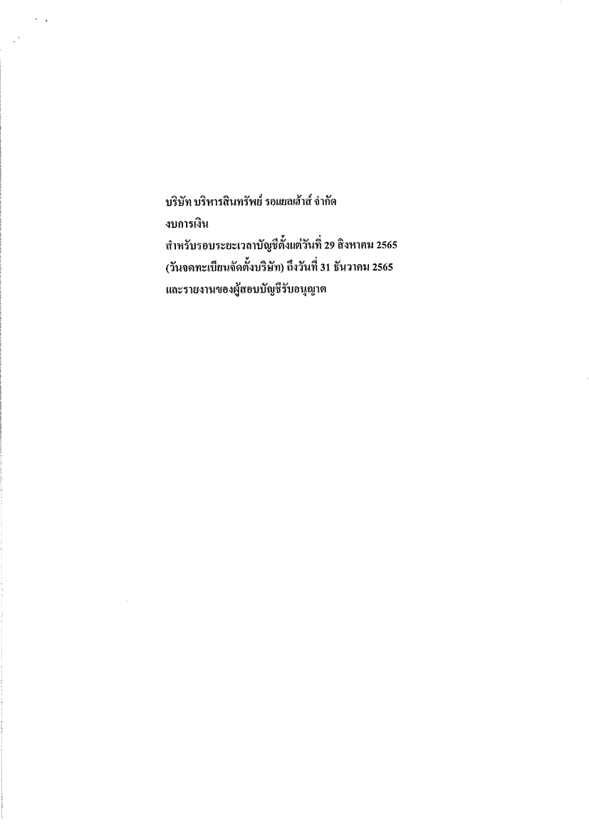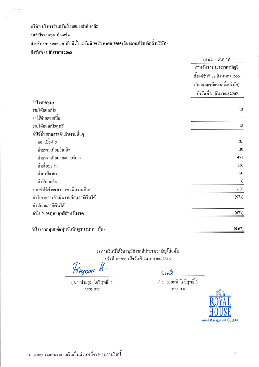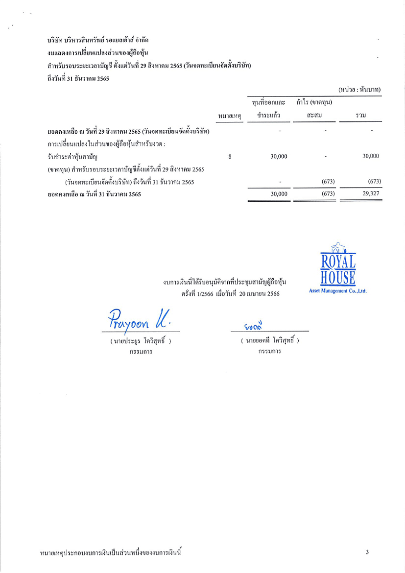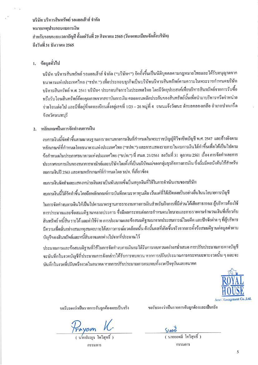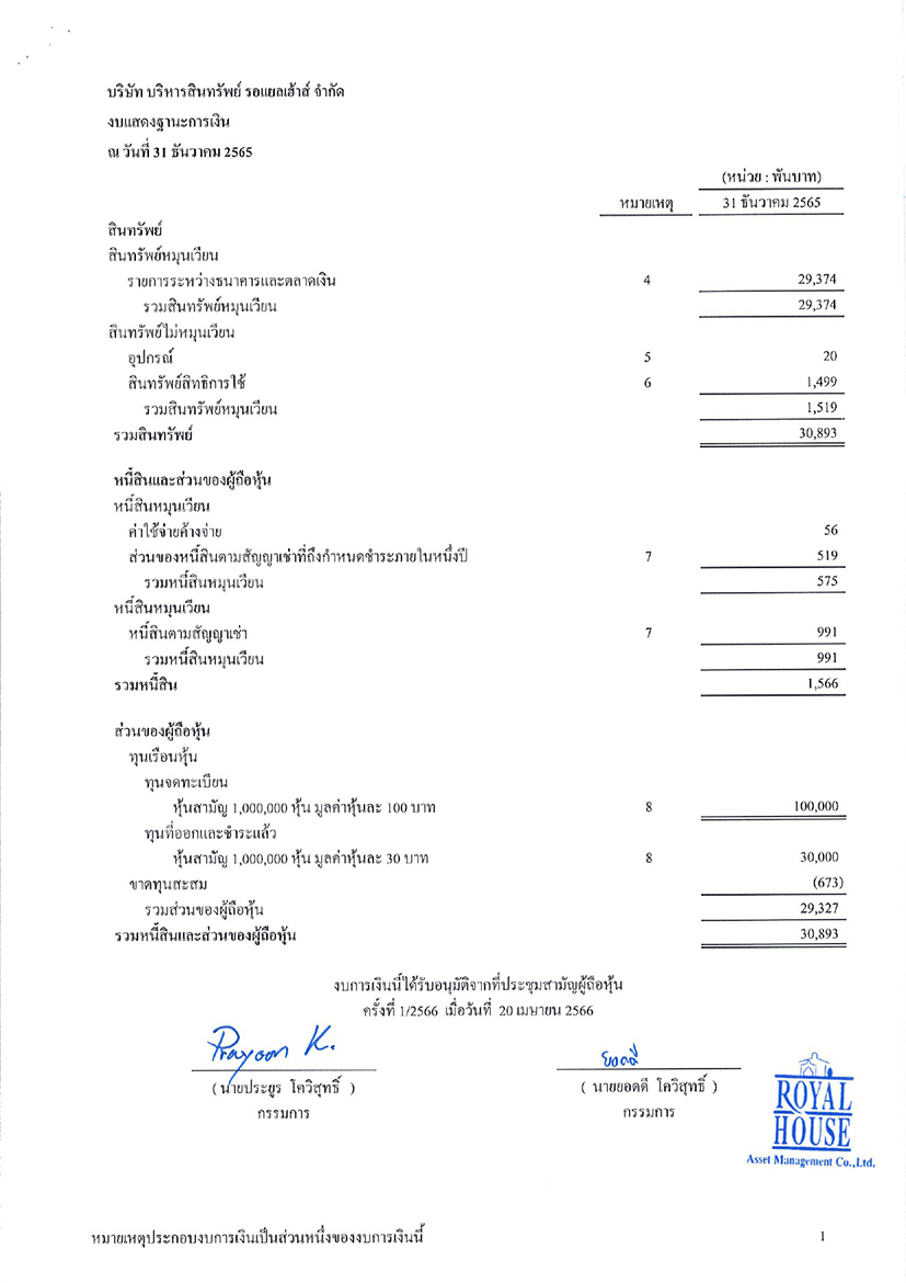 งบการเงิน 2565 บริษัท บริหารสินทรัพย์ รอแยลเฮ้าส์ จำกัด