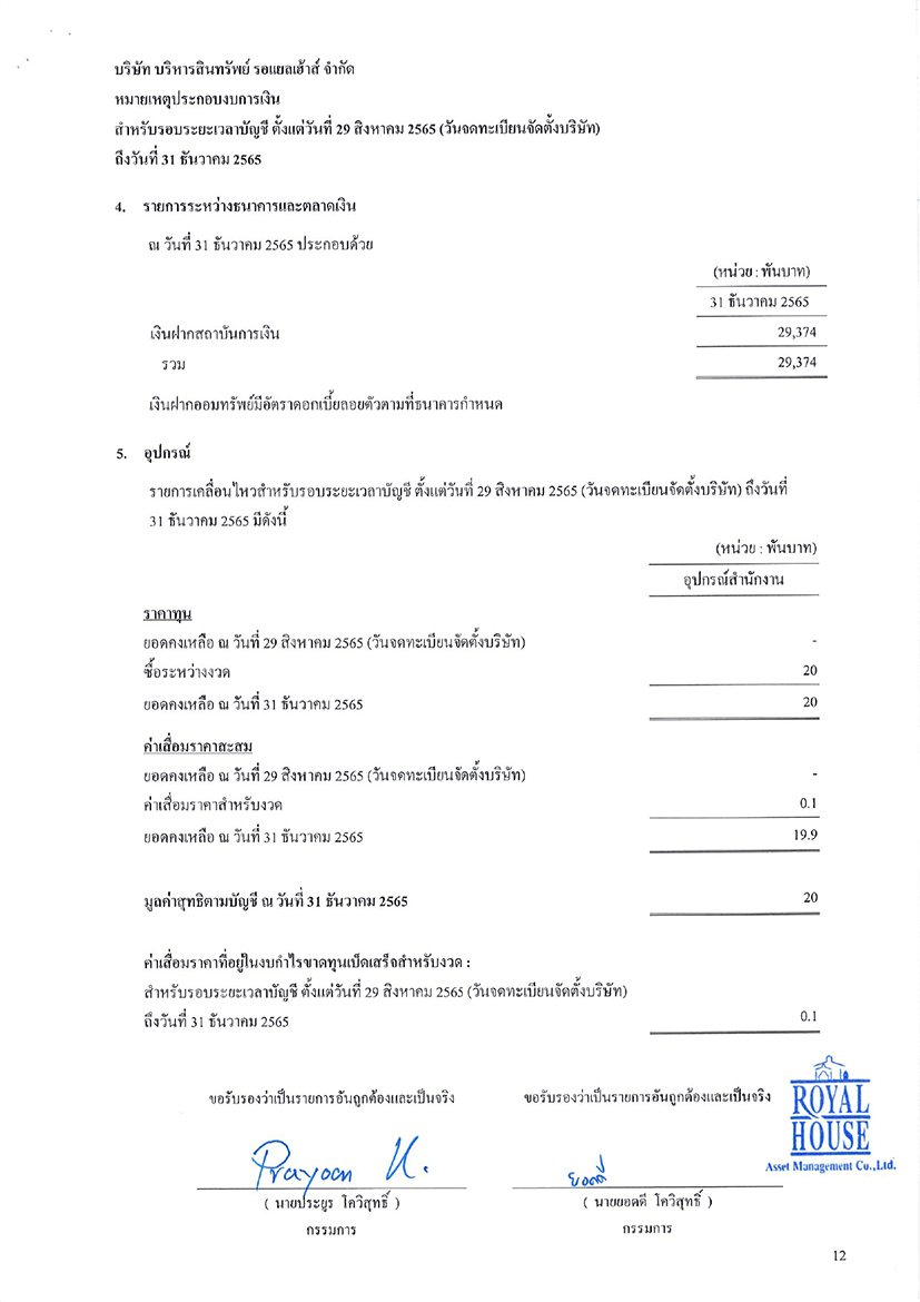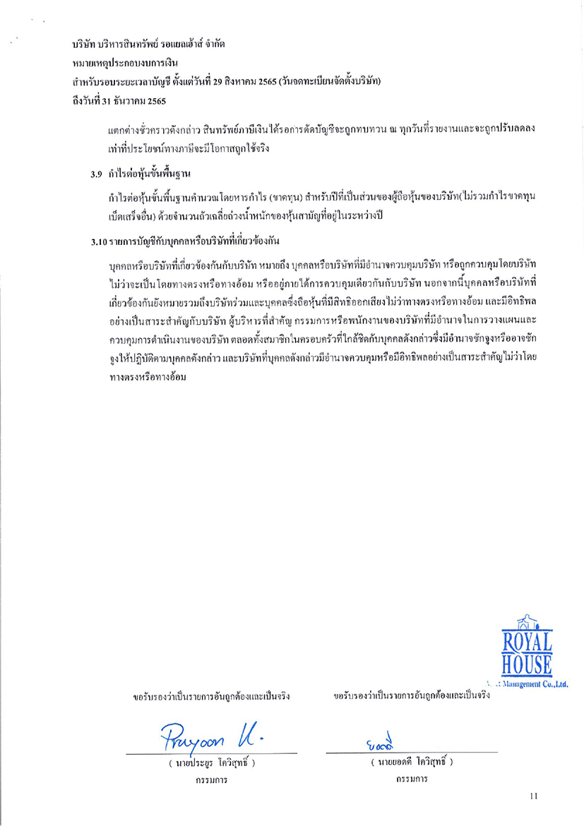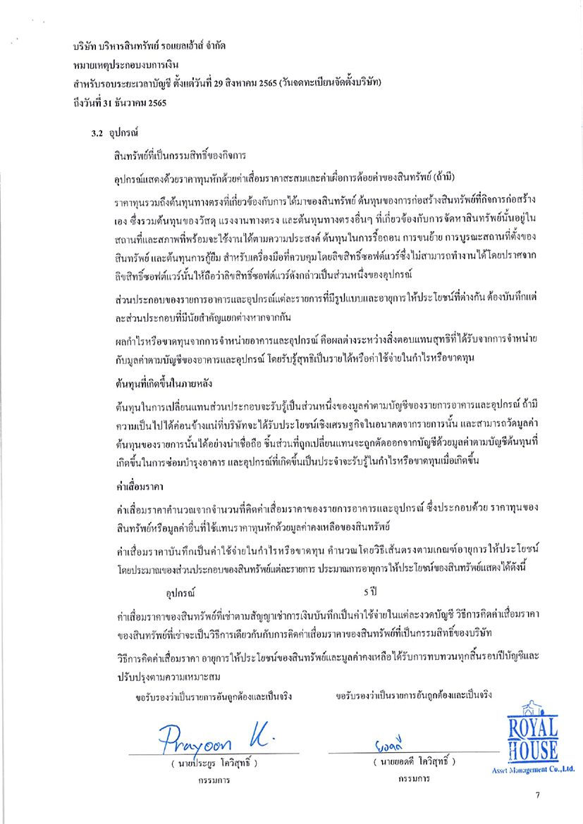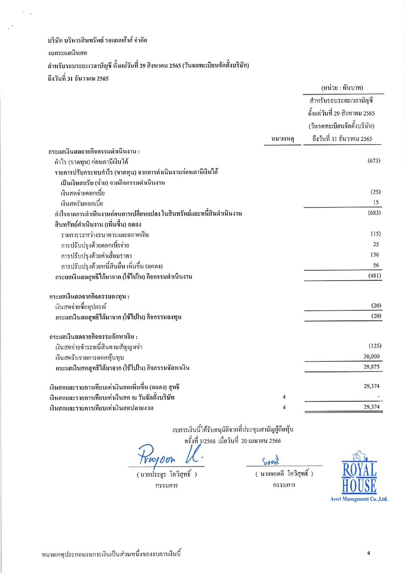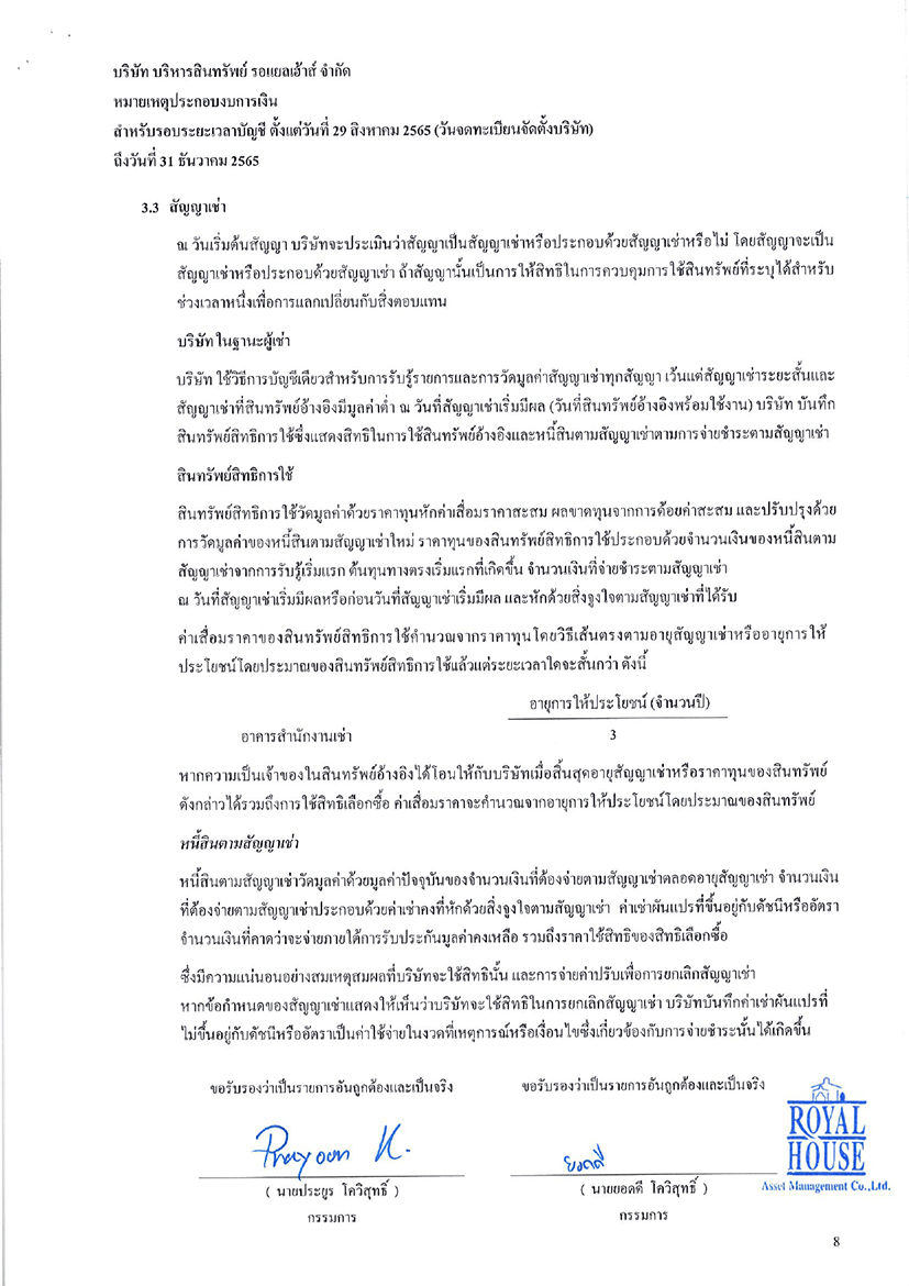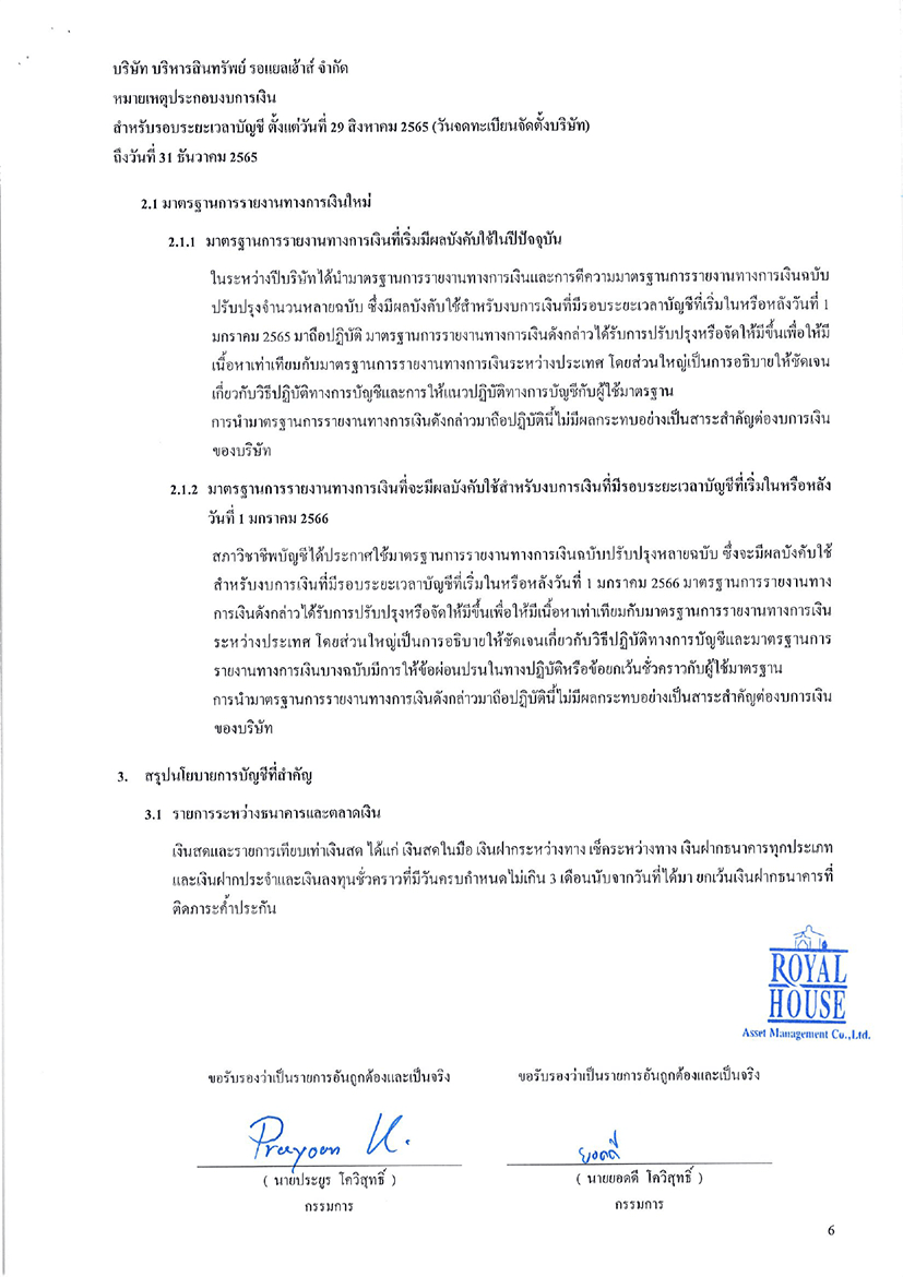 งบการเงิน 2565 บริษัท บริหารสินทรัพย์ รอแยลเฮ้าส์ จำกัด