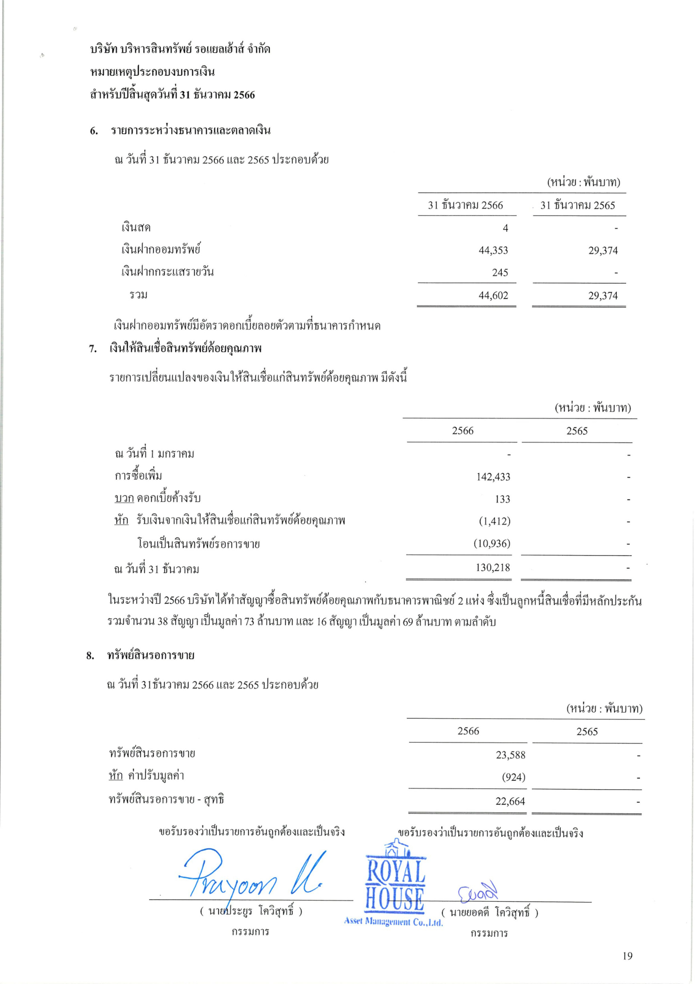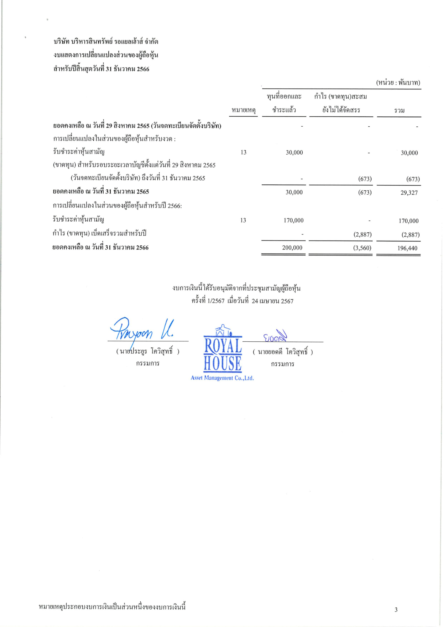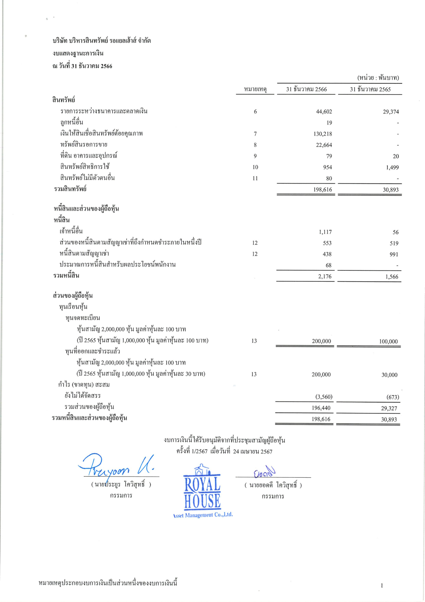 งบการเงิน 2566 บริษัท บริหารสินทรัพย์ รอแยลเฮ้าส์ จำกัด