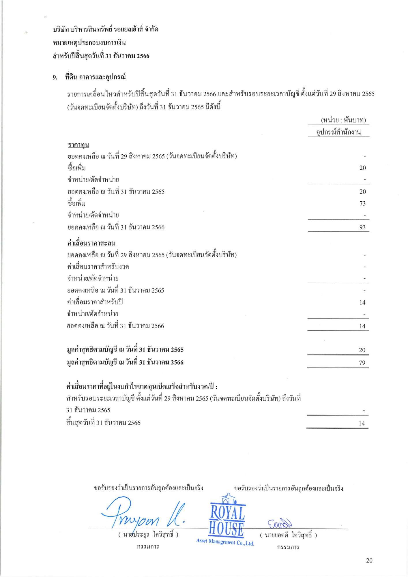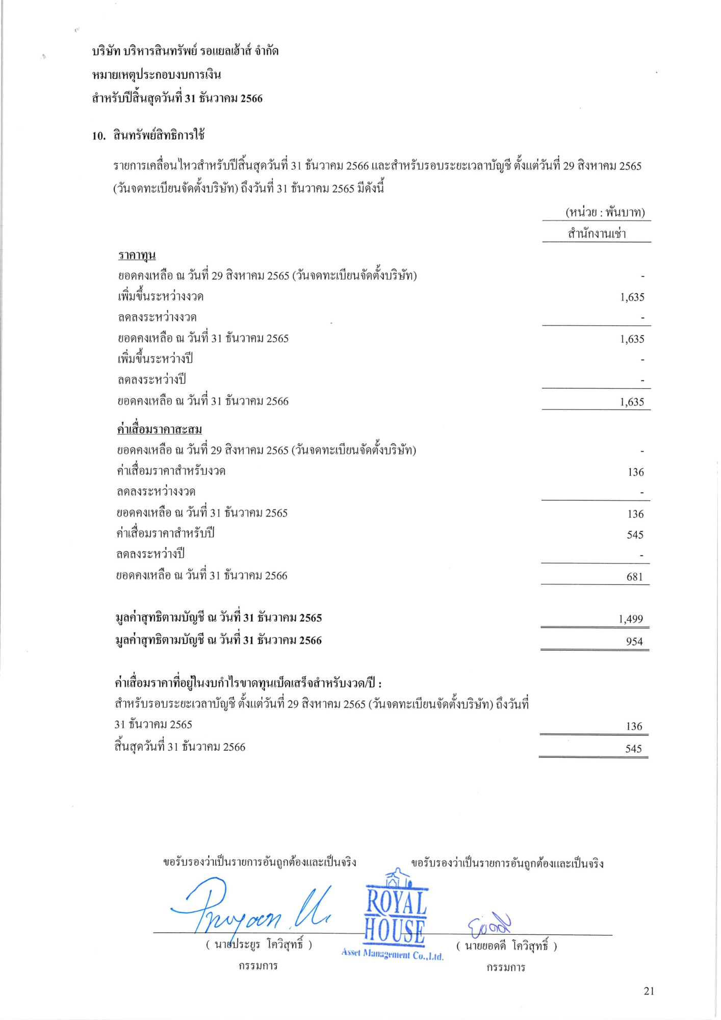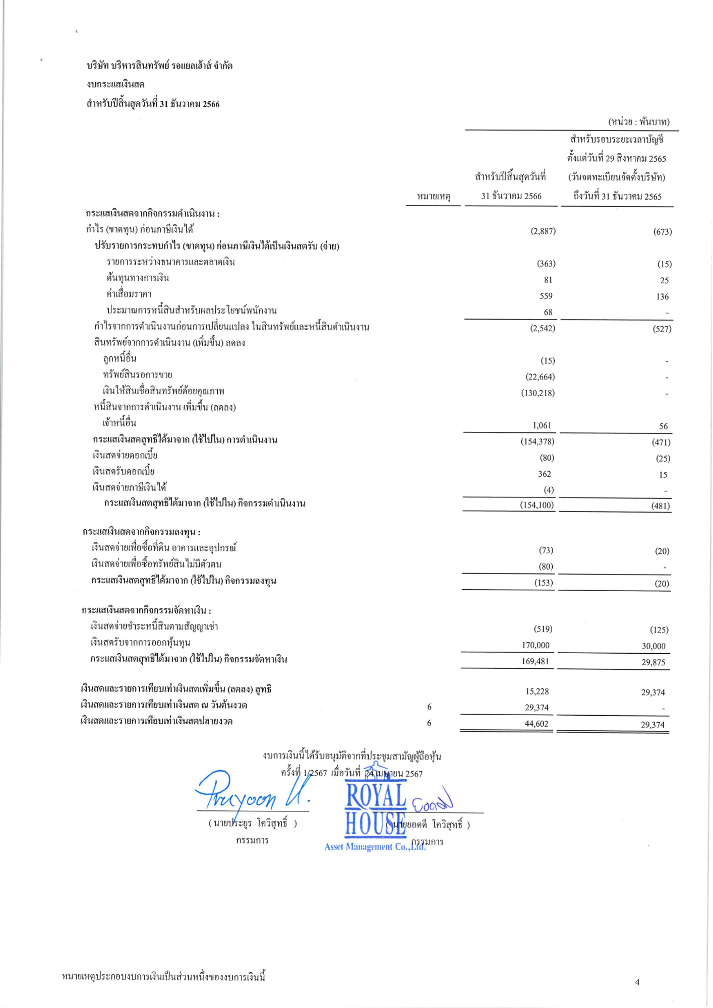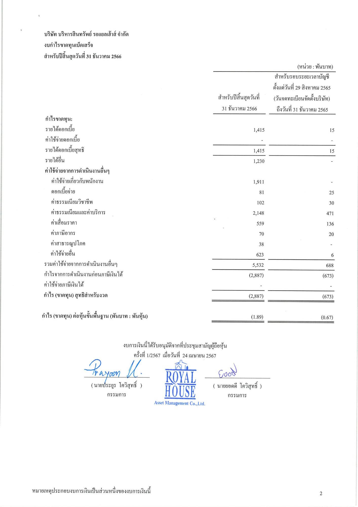 งบการเงิน 2566 บริษัท บริหารสินทรัพย์ รอแยลเฮ้าส์ จำกัด