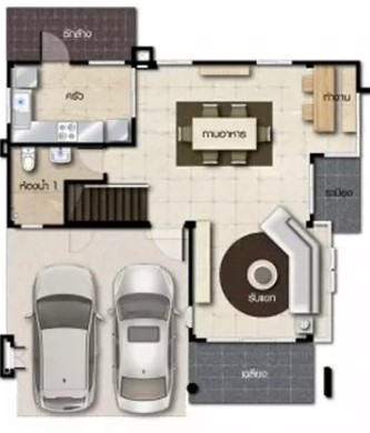 ชั้น 1 มีที่จอดรถ 2 คัน สามารถเข้าบ้านได้ 2 ฝั่ง โดยเมื่อเข้าบ้านมาแล้วจะเจอกับห้องนั่งเล่น ซึ่งเชื่อมต่อไปยังพื้นที่รับประทานอาหารตรงกลางบ้าน ห้องครัวเป็นครัวปิด ส่วนอีกฝั่งหนึ่งเป็นพื้นที่กระจกเข้ามุมมองเห็นวิวสวน