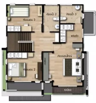 ชั้น 2 มีทั้งหมด 3 ห้องนอน โดยจะมีห้อง Master Bedroom อยู่ด้านข้าง มีพื้นที่ Walk-in Closet , ห้องน้ำในตัว พร้อมกับระเบียงส่วนตัวด้านหน้าบ้าน ส่วนห้องนอนรองจะใช้ห้องน้ำร่วมกันตรงกลางแบ่งห้องนอนออกเป็น 2 ฝั่ง คือฝั่งหน้าบ้านและหลังบ้าน ขนาดใกล้เคียงกัน